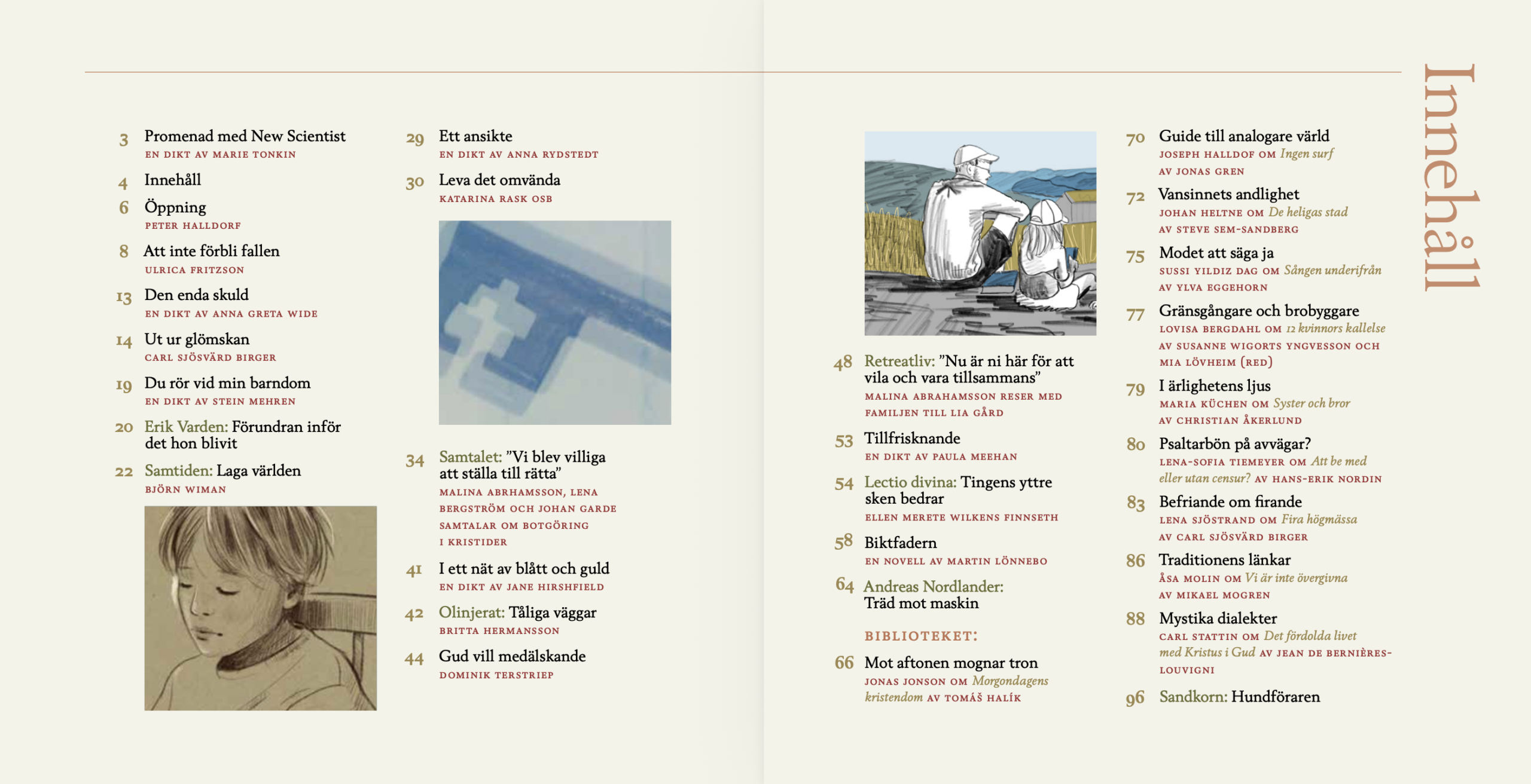 Nu tar vi ytterligare steg för att tillsammans med dig som läsare bidra till den inre vitalisering som alltid tar sin början i det lilla och oansenliga. Med denna utgåva, vår 127:e sedan starten, utökar vi på nytt antalet sidor i tidskriften för att ge ännu mer utrymme åt fördjupande texter i form av essäer, samtal, poesi, vägledning, livsberättelser och litteraturkritik. Efter den uppskattade reportageserien från europeiska kloster beger sig två av våra medarbetare, Elin Klemetz och Malina Abrahamsson, till nordiska retreatmiljöer dit allt fler söker sig. Här, vid sidan om allfarvägarna, klarnar det enkla och på samma gång självklara: att dra sig tillbaka några dagar för att stillna förmår skapa den inre resonans som inga genvägar tar oss till.